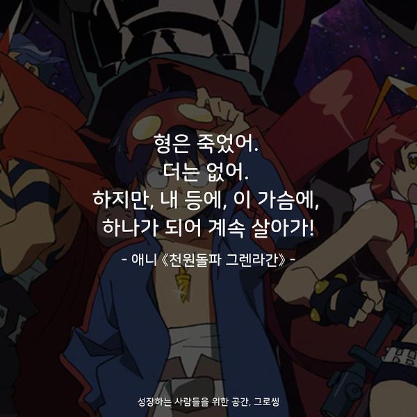 애니 명대사 형은 죽었어. 더는 없어. 하지만, 내 등에, 이 가슴에, 하나가 되어 계속 살아가! 형은 죽었어. 더는 없어. 하지만, 내 등에, 이 가슴에, 하나가 되어 계속 살아가! - 애니 《천원돌파 그렌라간》 - 그로씽 바로가기 천원돌파 그렌라간 - 시리즈 이마이시 히로유키,야마가 히로유키,코바야시 오사무 영화정보 보기 -