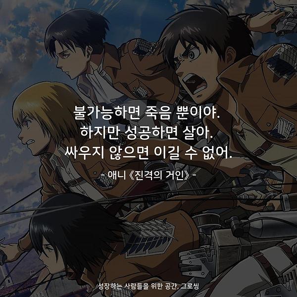 애니 명대사 불가능하면 죽음 뿐이야. 하지만 성공하면 살아. 싸우지 않으면 이길 수 없어. 불가능하면 죽음 뿐이야. 하지만 성공하면 살아. 싸우지 않으면 이길 수 없어. - 애니 《진격의 거인》 - 그로씽 바로가기 진격의 거인 아라키 테츠로 100여년 전, 갑자기 나타난 거인들에 의해 멸종 위기에 처한 인류는 살아남기 위해 50m의 거대한 벽을 쌓고 그 안에서 숨죽이며 살아가고 있었다. 그런데 어느 날, 초대형 거인의 등장으로 벽은 무너지고, 거인들이 벽 안으로 들어와 사람들을 잡아먹기 시작하는데. 절규와 죽음으로 가득한 절망적인 상황에서 거인에게 소중한 사람들을 빼앗긴 엘런은 복수를 맹세한다. 영화정보 보기 -