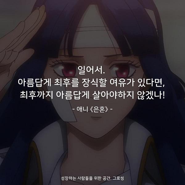 애니 명대사 일어서. 아름답게 최후를 장식할 여유가 있다면, 최후까지 아름답게 살아야하지 않겠나! 일어서. 아름답게 최후를 장식할 여유가 있다면, 최후까지 아름답게 살아야하지 않겠나! - 애니 《은혼》 - 그로씽 바로가기 은혼 후쿠다 유이치 우주 최강 해결사 ‘긴토키’, 세상을 파멸시키려는 자들에게 맞선 일생일대의 대전투를 시작한다! 에도 막부 말기, 천인이라 불리는 외계인의 습격으로 지구는 전근대와 미래가 공존하는 세상이 된다. 하지만 아직 사무라이 정신을 굳게 간직한 이가 있었으니, 그 이름은 은발의 무사 ‘긴토키’. 어리버리 조수 ‘신파치’와 왈가닥 괴력 미소녀 ‘카구라’와 함께 해결사 사무소 [요로즈야]를 운영한다. 어느 날, 긴토키의 옛 동료 ‘코타로’가 행방불명 되고, 불가사의한 의문의 사건들이 연이어 발생하면서 그 뒤엔 신비한 힘을 가진 불멸의 검 「홍앵」이 연관되어 있음을 알게 되는데….. -