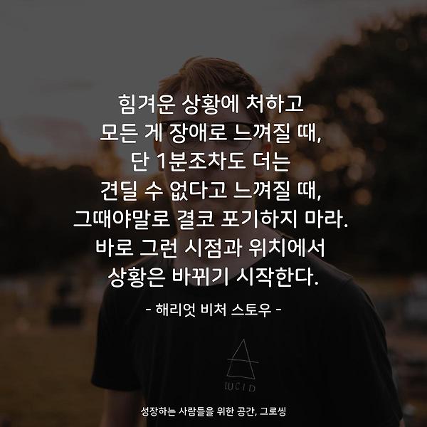 인물 명언 힘겨운 상황에 처하고 모든 게 장애로 느껴질 때, 단 1분조차도 더는 견딜 수 없다고 느껴질 때, 그때야말로 결코 포기하지 마라. 바로 그런 시점과 위치에서 상황은 바뀌기 시작한다. 힘겨운 상황에 처하고 모든 게 장애로 느껴질 때, 단 1분조차도 더는 견딜 수 없다고 느껴질 때, 그때야말로 결코 포기하지 마라. 바로 그런 시점과 위치에서 상황은 바뀌기 시작한다. - 해리엇 비처 스토우 - 그로씽 바로가기
