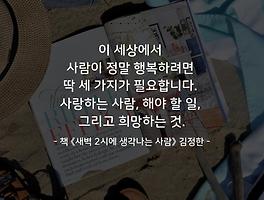 책속 한줄 어떤 특별한 사람은 행성 하나보다 더 큰 의미를 가질 때가 있어요. 그로씽 2020. 6. 15. 18:53 728x90 어떤 특별한 사람은행성 하나보다더 큰 의미를 가질 때가 있어요. - 책 《지구에서 한아뿐》 정세랑 - 그로씽 바로가기 지구에서 한아뿐 정세랑 책 읽으러 가기 공유하기 게시글 관리 그로씽 '책속 한줄' 카테고리의 다른 글 이 세상에서 사람이 정말 행복하려면 딱 세 가지가 필요합니다. 사랑하는 사람, 해야 할 일, 그리고 희망하는 것. (0) 2020.06.15 자연스럽게 다른 사람의 말을 잘 들어주는 사람이 되면, 저절로 이야기를 잘 하는 사람이 된다. 상대의 이야기에 귀를 기울이고 흐름에 빠져들면, 어떤 상황에서 어떤 말을 하는 것이 적.. (0) 2020.06.15 그러니까 너무 실망하지 말자. 이 좌절이 훗날 멋진 반전이 되어 줄 것이다. 위기가 깊을수록 반번은 짜릿하다. 포기하지 말자. 내 인생의 반전드라마는 아직 완성되지 않았다. (0) 2020.06.10 나 자신이 먼저, 그 다음이 상대, 마지막이 관계다. (0) 2020.06.10 사람은 귀를 기울일 줄 알아야 하고, 가만히 들을 줄 알아야 하고, 기다릴 줄 알아야 하며, 꿈꿀 줄 알아야 합니다. 그리고 예감을 열어 놓아야 합니다. 더 이상의 것은 나는 알지 못합니다. (0) 2020.06.05 '책속 한줄' 관련글 이 세상에서 사람이 정말 행복하려면 딱 세 가지가 필요합니다. 사랑하는 사람, 해야 할 일, 그리고 희망하는 것. 자연스럽게 다른 사람의 말을 잘 들어주는 사람이 되면, 저절로 이야기를 잘 하는 사람이 된다. 상대의 이야기에 귀를 기울이고 흐름에 빠져들면, 어떤 상황에서 어떤 말을 하는 것이 적.. 그러니까 너무 실망하지 말자. 이 좌절이 훗날 멋진 반전이 되어 줄 것이다. 위기가 깊을수록 반번은 짜릿하다. 포기하지 말자. 내 인생의 반전드라마는 아직 완성되지 않았다. 나 자신이 먼저, 그 다음이 상대, 마지막이 관계다.