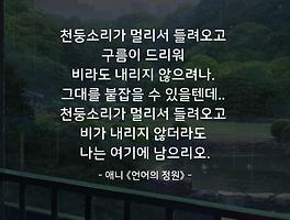천둥소리가 멀리서 들려오고 구름이 드리워 비라도 내리지 않으려나. 그대를 붙잡을 수 있을텐데.. 천둥소리가 멀리서 들려오고 비가 내리지 않더라도 나는 여기에 남으리오. (0) | 2020.08.13 |