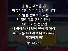 난 정말 외로울 땐 이렇게 앉아서 밤하늘을 쳐다봐 저 별들 중에서 하나는 내 별이라고 생각하면서 그리고 이런 순간엔 내 별이 늘 내 곁에 있어 줄 거야 부드러운 목소리로 위로해주지 '.. (0) | 2020.12.31 |