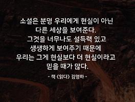 소설은 분명 우리에게 현실이 아닌 다른 세상을 보여준다. 그것을 너무나도 설득력 있고 생생하게 보여주기 때문에 우리는 그게 현실보다 더 현실이라고 믿을 때가 많다. (0) | 2020.04.20 |